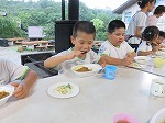 みんなで育てた玉ねぎ・じゃがいも・ナスが入ったカレーライスを「おいしい!」「おかわり!」とおなかいっぱい食べました。