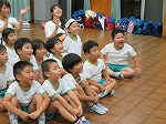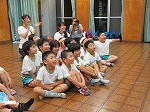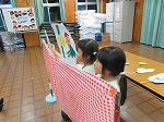 年長ゆり組は待ちに待った宿泊保育に行きました。おうちの方と離れて大きな荷物を持って出発!雨の中、元気いっぱい歩きました。「よく頑張って歩いてきたね」とセンターの指導員さんに一人一人出迎えてもらいうれしそうな子ども達でした。「今日からお世話になります」入所式をしました。自分たちで作ったゆり組探検隊の旗を飾りました。