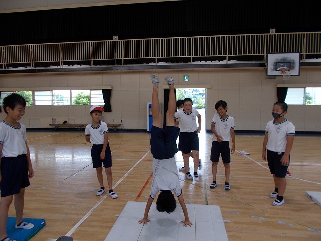 4年生は甘南備園の出前授業を受けました。5年生は倒立前転と倒立後転に挑戦しています。