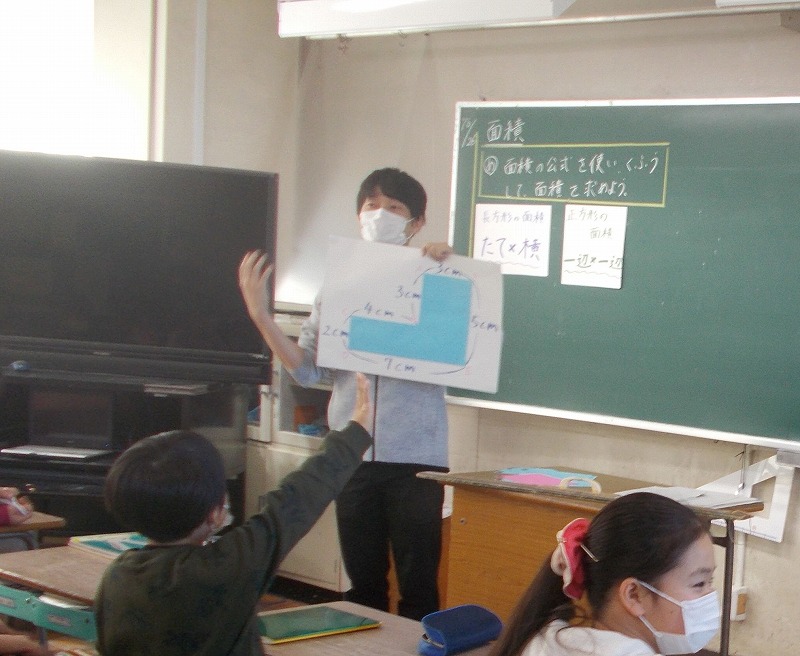 今まで学習した面積を求める公式(長方形=たて×よこ、正方形=一辺×一辺)を使って逆L字型の面積を求め方を考えました。