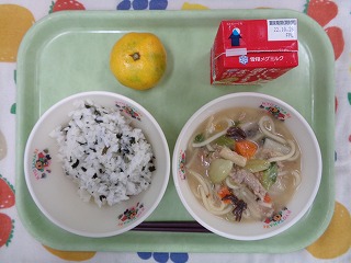 給食では、わかめご飯との組み合わせで、子どもたちは、