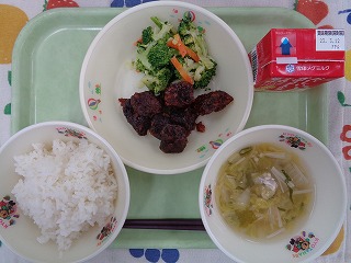 給食では、片栗粉をまぶして揚げてから、ケチャップ味