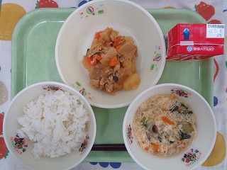 キムチは韓国の漬物で、腸をきれいにしてくれる乳酸菌、代謝を助けるカプサイシンなど、たくさん栄養があります。じゃが豚キムチは、豚肉と玉ねぎなどの野菜を炒めて、味のポイントになる白菜キムチが入ります。じゃが芋も入っているので、キムチの辛さもやわらかく、食べやすい味になりました。