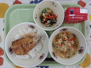 給食では、片栗粉をつけて揚げたいわしをごはんにのせて