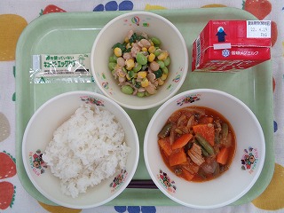 今日は、サラダに大豆や枝豆などが入っています。きゅうりのポリポリとした食感もよいので、よく噛んで食べましょう!