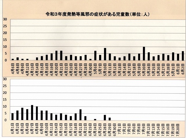4~6月の「発熱等風邪の症状がある児童数」の推移です。日々健康に気を配っていただきありがとうございます。残る7月もよろしくお願いいたします。