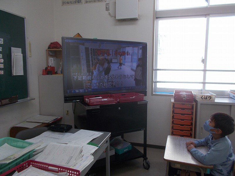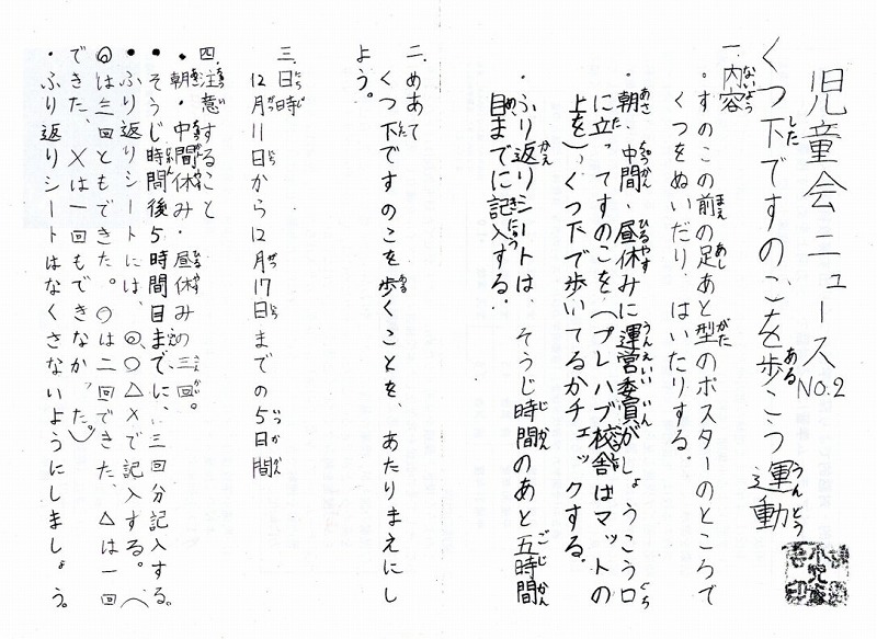 「児童昇降口のすのこに下靴のまま上がって上靴に履き替える人がいる」ことに問題意識を持った児童会が「くつ下ですのこを歩こう運動」を企画しました。ビデオ映像で呼び掛けると共に、取組プリントを配付しました。