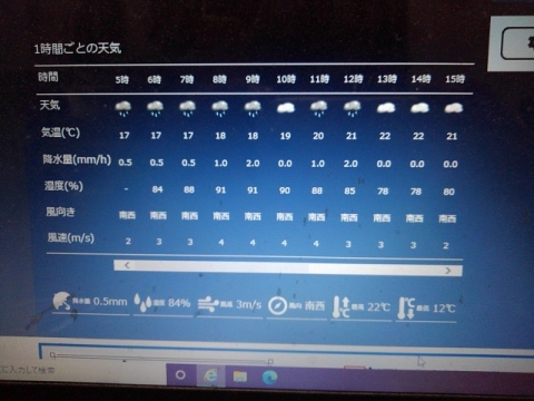 現地のこれからの天気変化です。昼前後に寒冷前線が通過しそうです。最新情報と現地スタッフの助言を得て、安全第一で行ってきます。