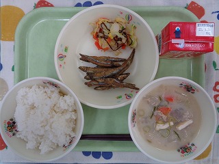 今日の給食は、お茶風味のきびなごのお茶揚げです。
