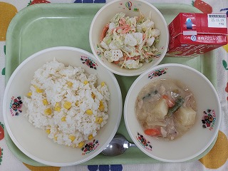 給食では、ご飯と一緒に炊き込んだコーンライスです。