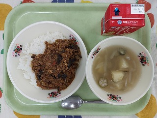 肉、鶏肉は京都府産のものでドライカレーとスープの給