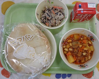 給食では、チリコンカーンをピタパンにはさんで食べま