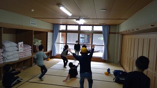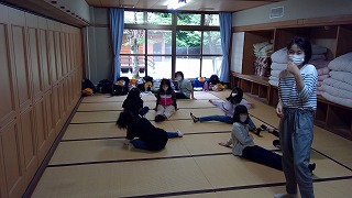 8時45分から館内清掃がありますが、それまでは、部屋で自由行動です。班でいろいろ工夫した遊びを考えて楽しく過ごしています。