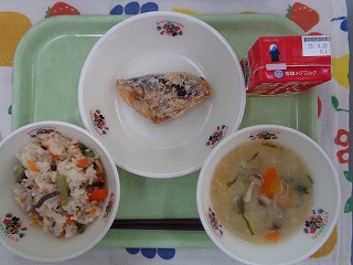 今日の山菜ごはんには、わらびやふきなどの山菜が入っ