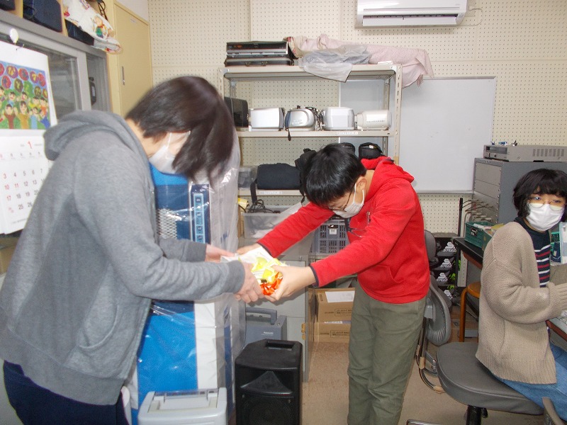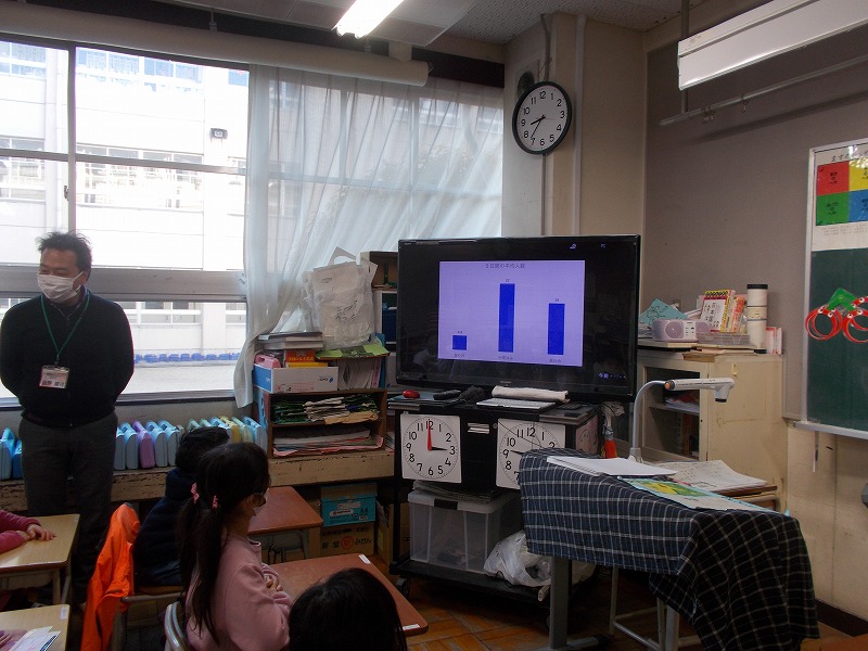 前半は「くつ下ですのこを歩こう運動」のまとめを動画を見ました(写真左)。後半は給食週間として調理員さんへの感謝の手紙を渡しました(写真右)。