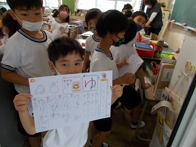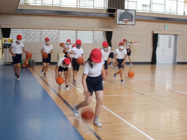1年生は「ひらがな」学習の最終段階です。書いた字を担任の先生に見てもらっています。6年生バスケットではドリブル練習をしています。大きなボールなのでコントロールに苦労しながら頑張っています。