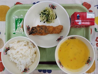 給食には、鮭フライ、グリーンサラダ、かぼちゃのス
