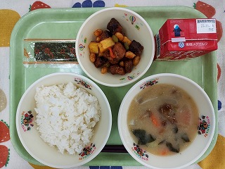 かつお 大豆 さつまいも 人参 枝豆です。それぞれ油で揚げてから、ケチャップと醤油を使った甘辛いたれで味付けします。揚げると、かつおはしっかりと歯ごたえがあり、ほかの大豆やさつま芋・人参もいろいろな食感があります。よく噛みながら、いろいろな食感を楽しんで食べてほしいです!