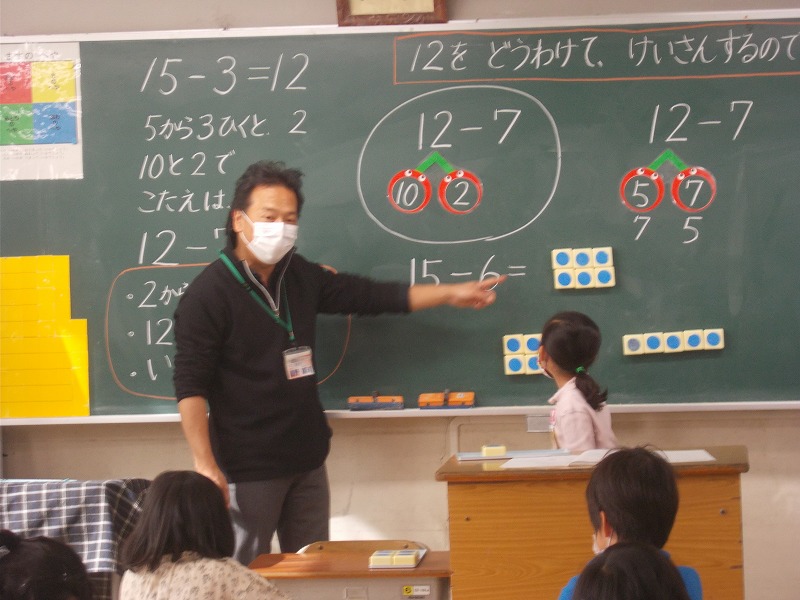 「12-7」「2から7は引けません」「12を10と2に分けます」「10から7を引くと3になります」「3と残りの2を足して5になります」 数字ブロックを使って考え方を確認しています