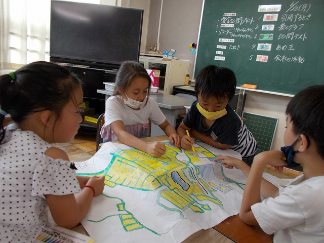 6年生になるとキックベースボールの試合も迫力があります。3年生はグループで校区の便利しらべのまとめをしています。