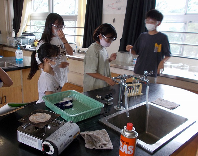 6年生理科「水よう液の性質」の実験です。色や臭い、加熱したときの変化から、試験管に入っている水溶液は何か?を考察します。中学校理科につながる学習です。昔と異なり、保護目がねを付け、安全面からアルコールランプに替わりカセットコンロを使っています。