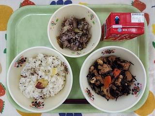 芋類はでん粉が多く、エネルギーのもとになるので、黄色の仲間に入ります。芋類にはビタミンCやカリウムが含まれ、食物繊維も多く含まれているので、おなかの調子を整えてくれたりとよい働きがあります。給食では、ごはんに炊き込んだ『さつま芋ごはん』です。さつま芋の甘味も増して、美味しくなりました。
