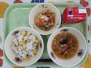 給食では、むき栗を使いました。ご飯と一緒に炊くとホクホクとして美味しいです。