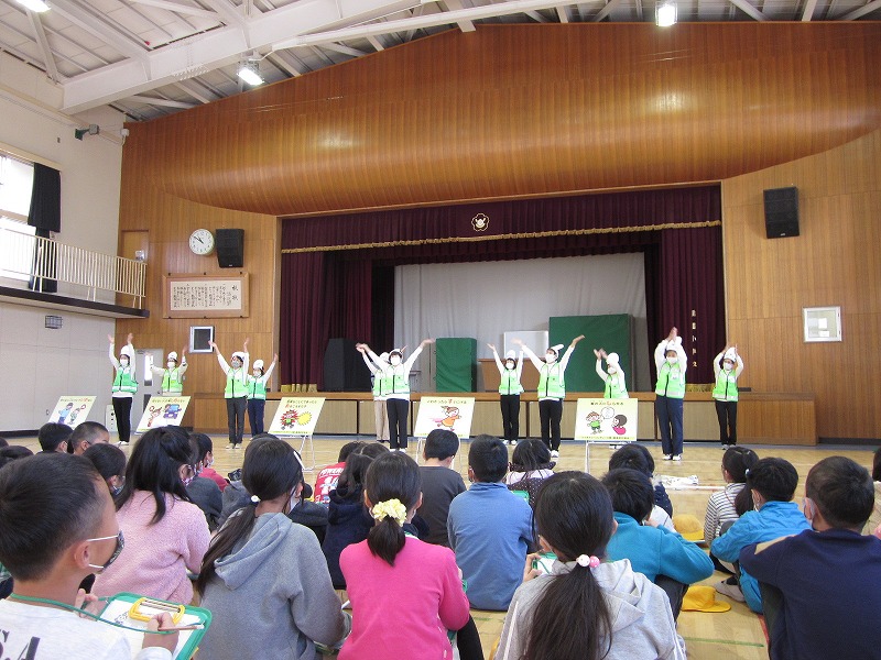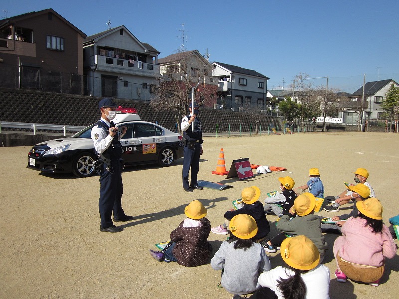 社会科「安全なくらしをまもる」単元の学習です。署員の説明の後、実際にパトカーに乗せてもらいました。防犯推進委員レディス隊「イカのおすし」ダンスを見て、自身で自分たちを自衛することの大切さも学びました。