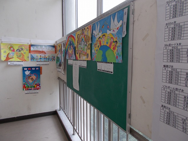 5年生は制作したボードカレンダーを廊下に展示しています。6年生は各教室に「自転車のある風景」を掲示しています。また南校舎2~3階の踊り場に平和ポスター入選作品と校内陸上記録会の上位入賞者の紹介をしています。他学年も児童の頑張りを掲示・紹介しています。