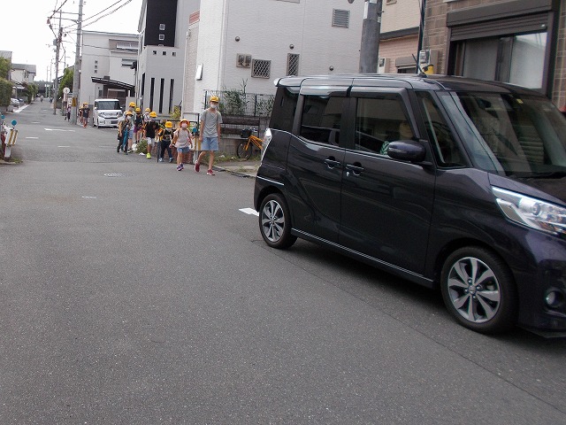 山手幹線の赤信号待ちをしていた児童が20~30名の集団でこの交差点にやってきます。桃園小に向かう道路もの通量が多く、健康ヶ丘東から下りてくる車も写真の位置で数珠つなぎになりがちです。