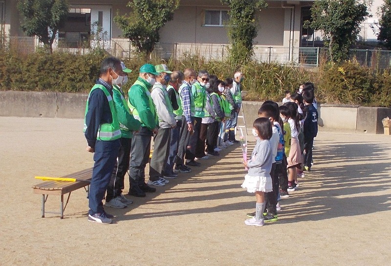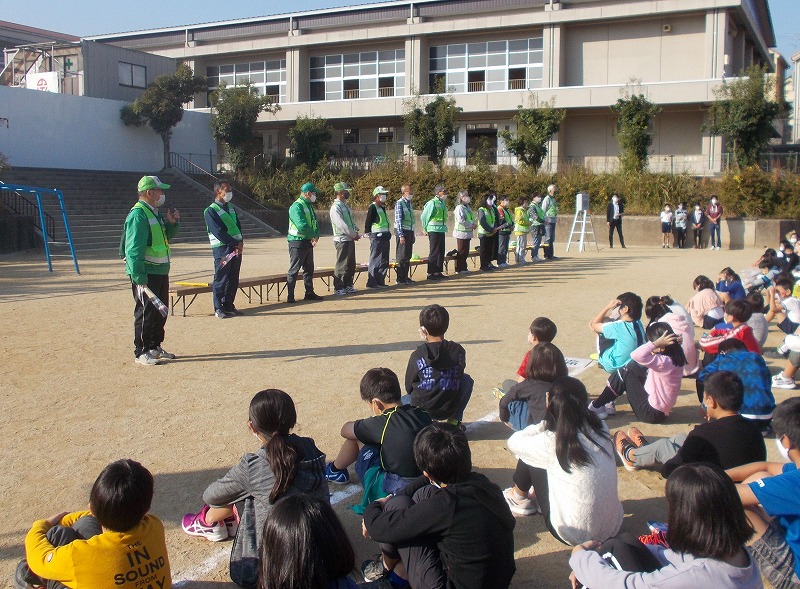 例年は3月の行事ですが、コロナに加えてインフルエンザ流行の心配も考えて、季候の良い10月に運動場で開催しました。毎日安全な登下校ができることに感謝の気持ちを持ちましょう。PTA地域委員の皆様もありがとうございました。