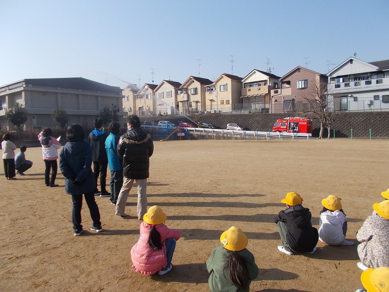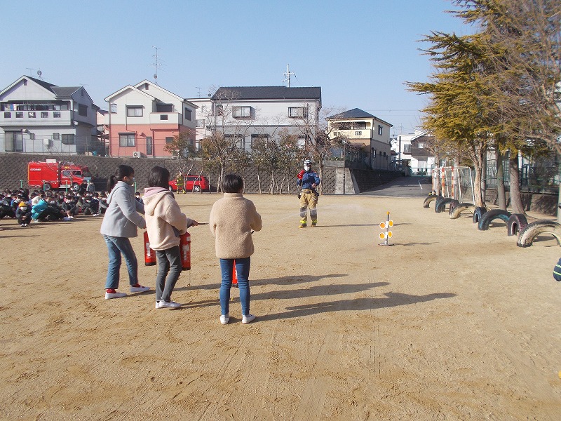 京田辺消防署の方に来校いただき、放水訓練を見せていただくと共に、消火器訓練も体験させてもらいました。