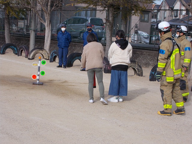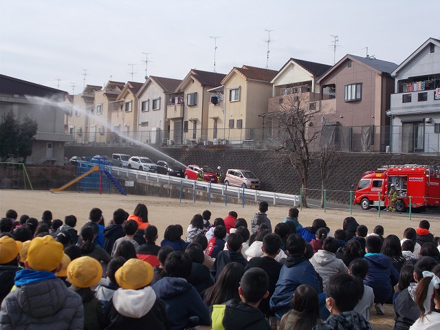 火事を想定した訓練でした。京田辺市消防署北部分署にもお世話になり、消火器の扱い方を教えてもらった後、放水訓練を見せていただきました。