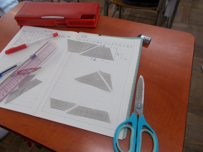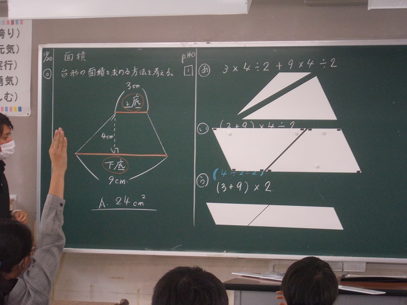 昭和時代は「(上底+下底)×高さ÷2」という公式を丸暗記させて、ひたすら練習問題で慣らしていく授業でした。令和時代は、今まで学習した三角形や長方形などの図形の面積求め方を使えるように台形をバラして、自分で一番効率的な「台形の面積の求め方」に気付かせていく授業の流れに変わっています。