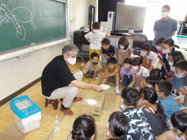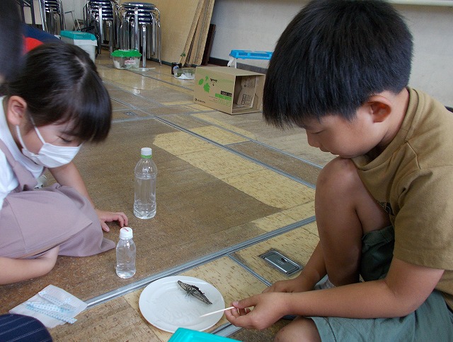 アゲハチョウのお話の後、実際にチョウにさわったり、蜜を飲ませたりしました。