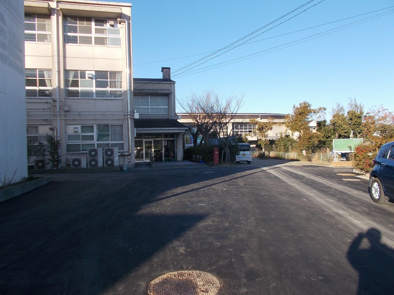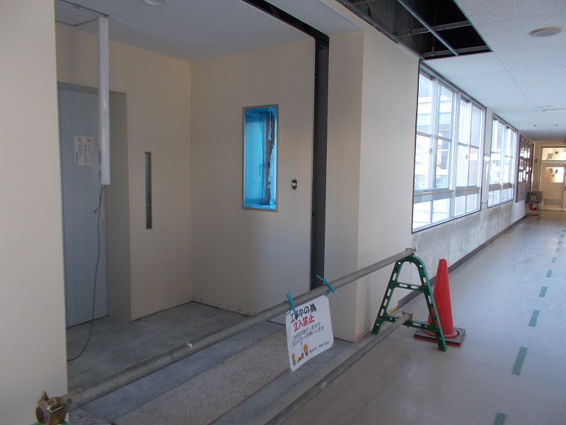 廊下の工事覆いが外されてエレベーター本体が姿を見せました。また付帯工事として職員玄関前を車椅子でも支障なく通れるようにアスファルト舗装されました。ありがたいことです。