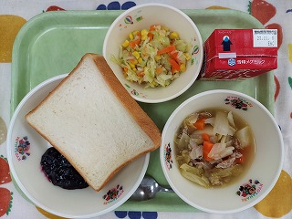 ブルーベリーに含まれる「アントシアニン」には、目の疲れを改善する働きがあります。アントシアニンは、ブルーベリーの他にも、紫芋や、小豆、黒豆などにも含まれています。今日は、ブルーベリーで作ったジャムです。給食室の大きな釜で、ブルーベリーや砂糖などを混ぜながらゆっくりコトコトと煮て、美味しく出来上がりました。パンと一緒に美味しそうに食べてくれました!