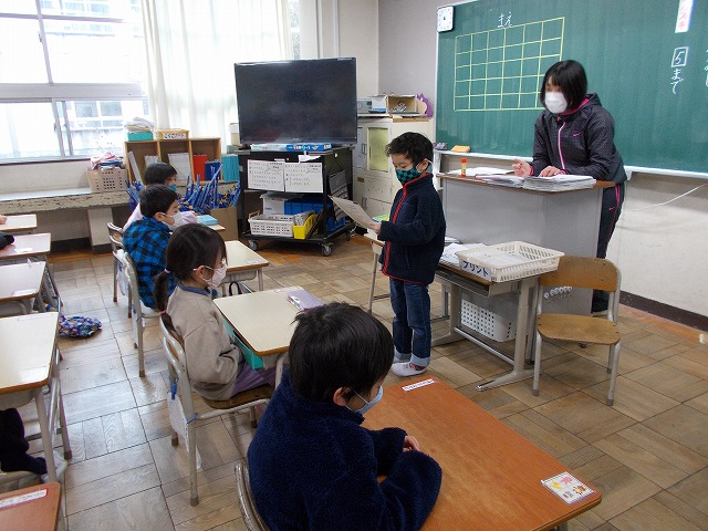 明日は標準学力テスト(国)があります。下校時刻は1~2年が14:40、3~6年は15:25です。