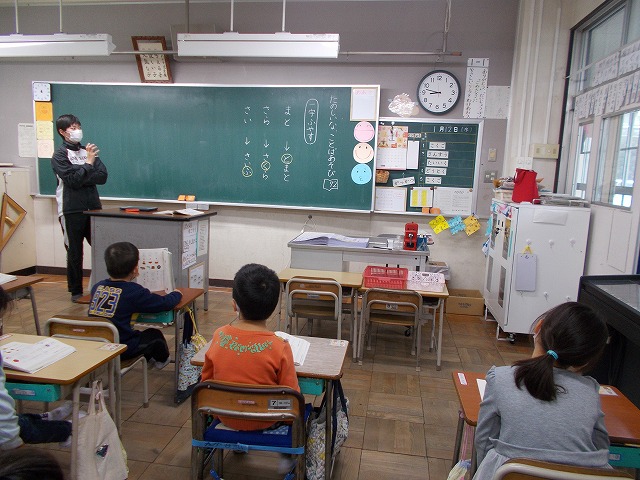 朝の会の司会も当番がしっかりできています。(写真左)「たのしいな、ことばあそび」のようすです(写真右)。「まと」の上に「と」をふやして「トマト」のように、1字ふやして言葉を変身させる学習です。考えさせたところ「まと」の下に「め」をふやして「まとめ」という答が出てきたことに感心しました。