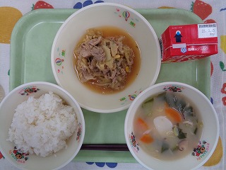 今日の給食では、豚肉を使い野菜と炒めて、醤油、みり