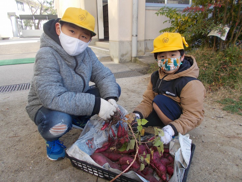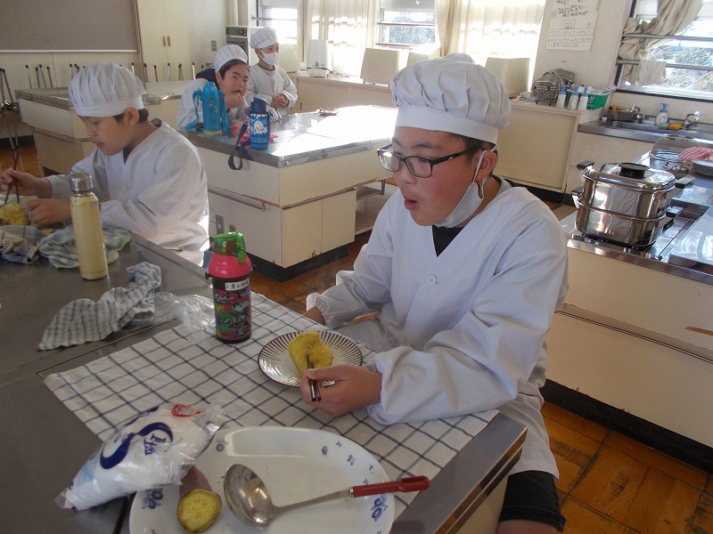 ファームで育てたサツマイモ(写真左)を各自で蒸かして食べました(写真右)。