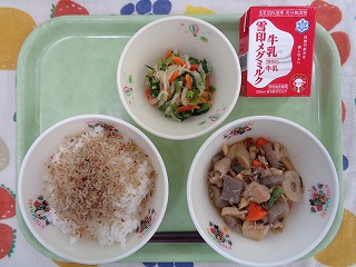 今日の給食には、ごぼうやたけのこなど、食物繊維を多く