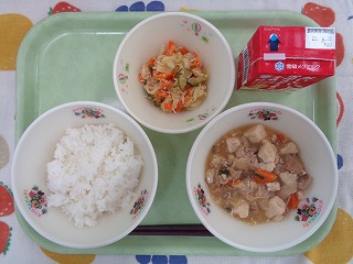 今日の給食では、三種類の野菜とササミフレークをごま油で炒めて砂糖、醤油・酢で味付けをしました。ナムル風の炒め物です。炒めることで、酢の酸味もやわらかくなり、子ども達も、よく食べてくれました。