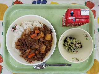今日は、きのこ入りビーフカレーです。牛肉に、しめじ、マッシュルーム等のきのこが入って、秋らしいカレーになっています。