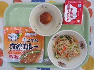 今日の給食は、救給カレーです。