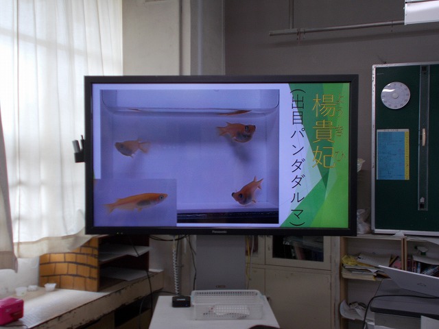 品種改良をしていろいろな色や形をしたメダカを作り出している先生の話を聞きました。今まで見たことのないメダカに興味津々でした。