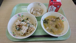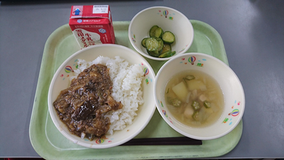 献 立:一休納豆入りマーボーなす丼、きゅうりの華風和え、じゃがいものスープ、牛乳