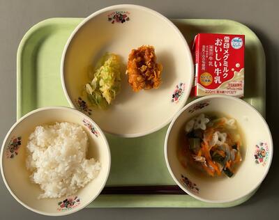 ◎鶏肉のフレーク揚げ ◎米粉マカロニのスープ ◎添えキャベツ