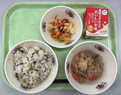 今日は、「いい歯の日献立(こんだて)」です。よくかんで食べる料理として、「切り干し大根のハリハリ漬け」があります。30回ずつかんで食べましょう。食べ終わった後は必ず歯みがきをしましょう。