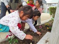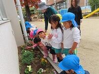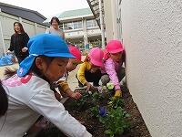 「たまねぎみたい」「にんにく?」「何色のお花が咲くかな?」口々に話しながら土のお布団を掛けて植えました。
